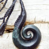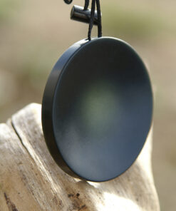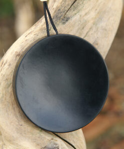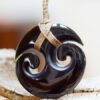 Großes Diskus Carving aus schwarzer Nephrit Jade in seidenmattem Finish am schwarzen Band mit Schiebeknoten.