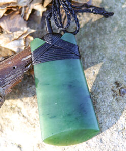 Breites Toki Carving aus Nephrit Jade, seidenmattes Finish, traditionell eingebunden am Flechtband mit Schiebeknoten.