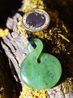 Großes Twist Carving aus Nephrit Jade am traditionellen Band mit Schiebeknoten, Hochglanz-Finish.