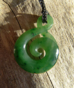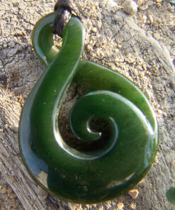 Koru Twist Carving aus grüner Nephrit Jade am traditionellen Wachsband mit Schiebeknoten, Hochglanz-Finish.
