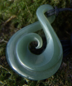 Koru Twist Carving aus blassgrüner Nephrit Jade am traditionellen Wachsband mit Schiebeknoten, glänzendes Finish.